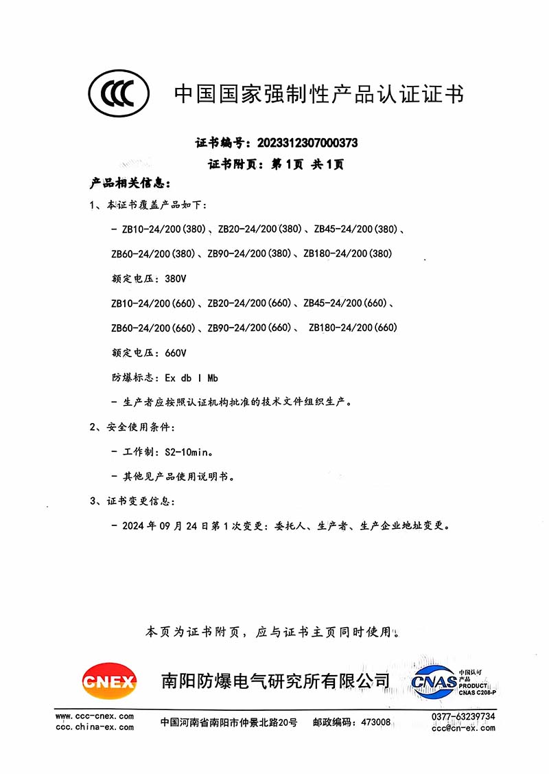 礦用隔爆ZB10-24中國國家強制性產品認證證書110.1